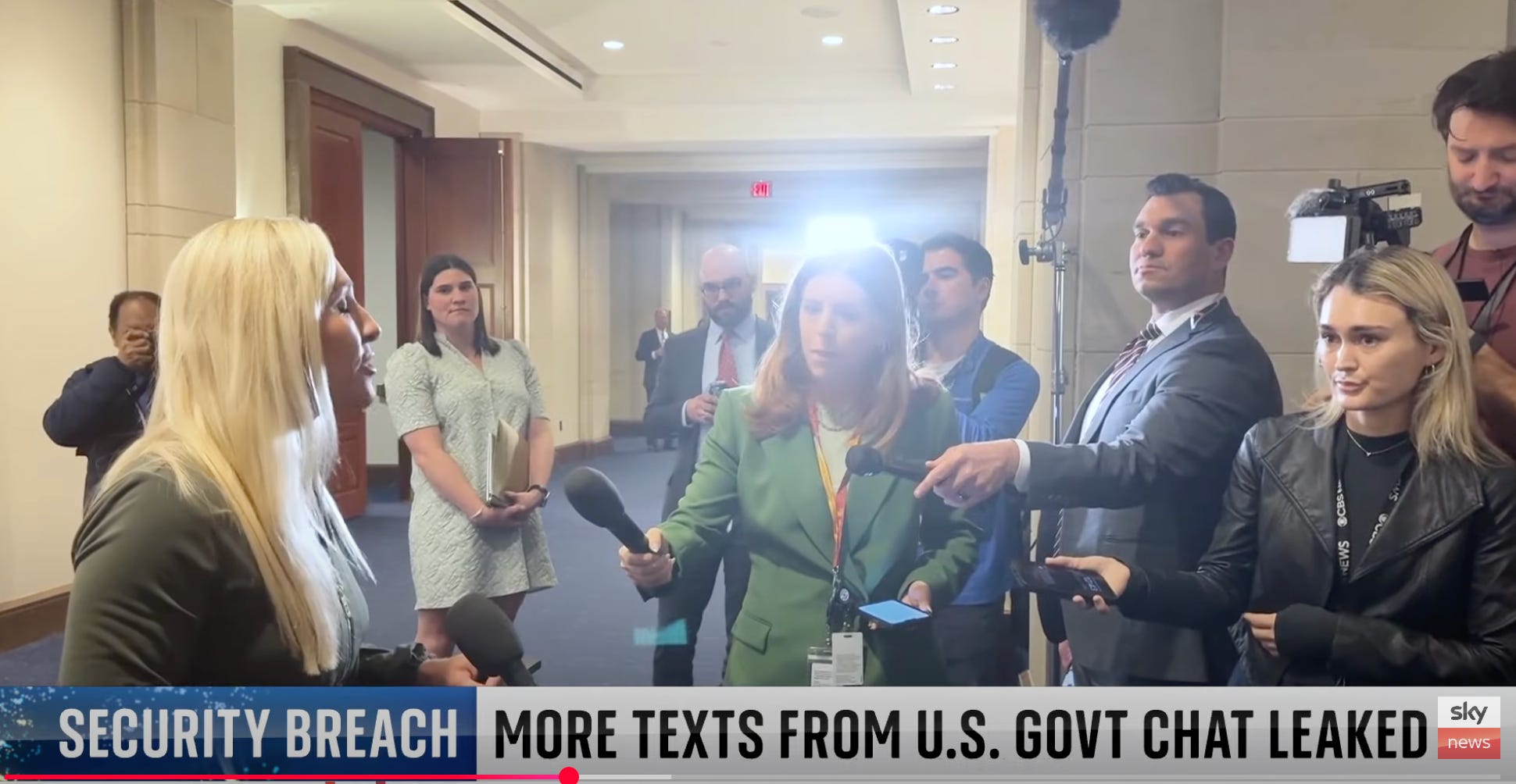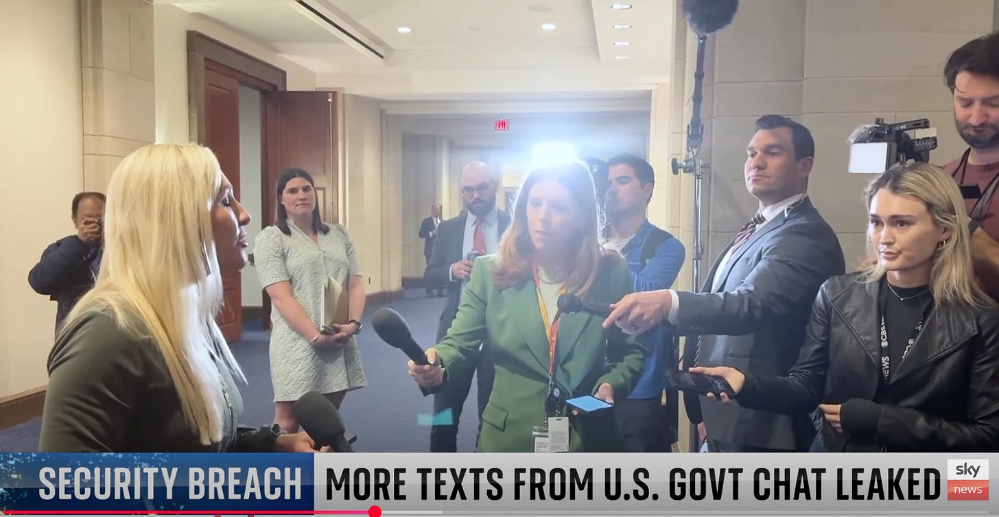 The newest entrant worthy of our praise is Sky News’s Martha Kelner, who, in asking Representative Marjorie Taylor Greene whether Defense Secretary and Signal mis-user Pete Hegseth should resign for discussing secret military plans on a commercial messaging app and inadvertently disclosing them to a journalist (whew!), was suddenly in this conversation: